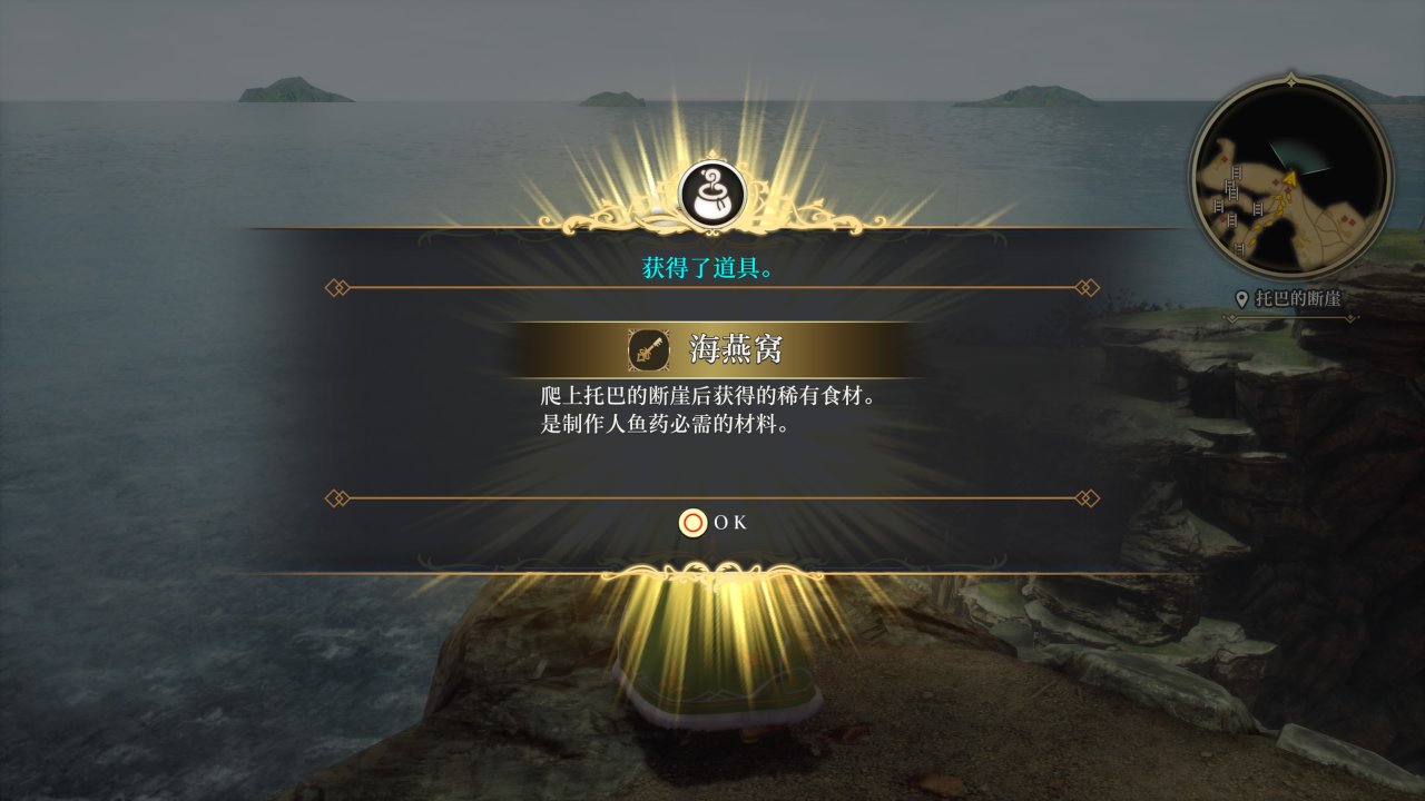最後傳送至「託巴」爬上海邊懸崖後取得「海燕窩」,途中寶箱記得拿。