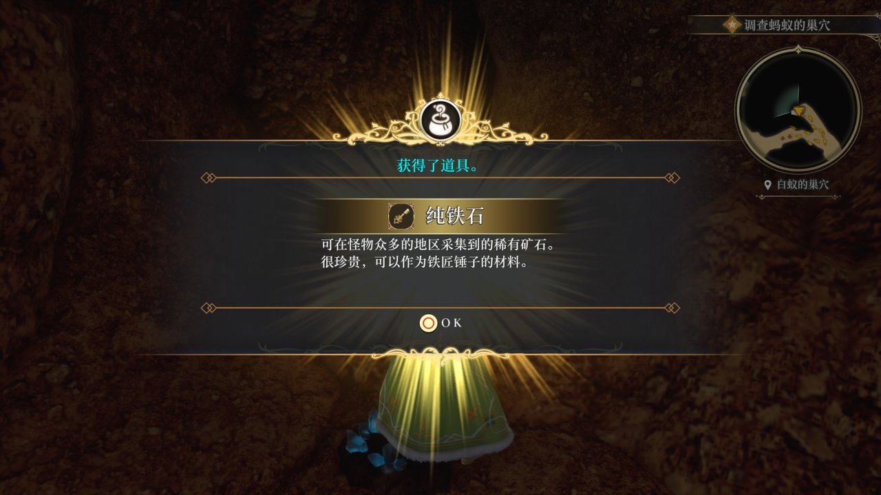 以上開圖路線完成後傳送回「南方聚落」獵人處接取討伐蟻后任務,入夜後劇情前往蟻穴討伐蟻后,蟻穴內的寶箱會拿到「純鐵石」是鐵匠入隊任務的關鍵道具,分別散落在不同地區。