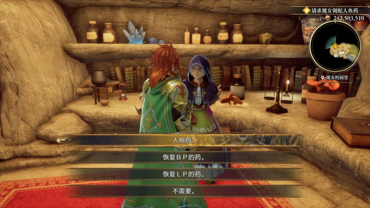 前往「魔女的祠堂」在深處遇到魔女後選擇購買任意一瓶藥,BP/LP藥均可,購買後從魔女處得知「梅魯沙漠西」地點,人魚藥接了可以暫時不用管。
