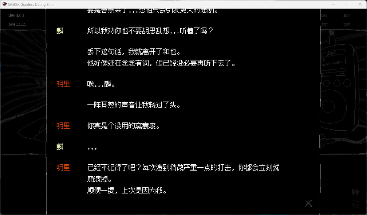 麟和冴子的扭曲感情(应该算恋情吧...)在屠杀线和赎罪线都有实现。屠杀线的二人舍弃了所有的道德,彻底堕落,赎罪线的麟最后带走了冴子,抽屉里的家具说明应该照顾的不错,也就是说麟选择了为自己当时的选择赎罪。