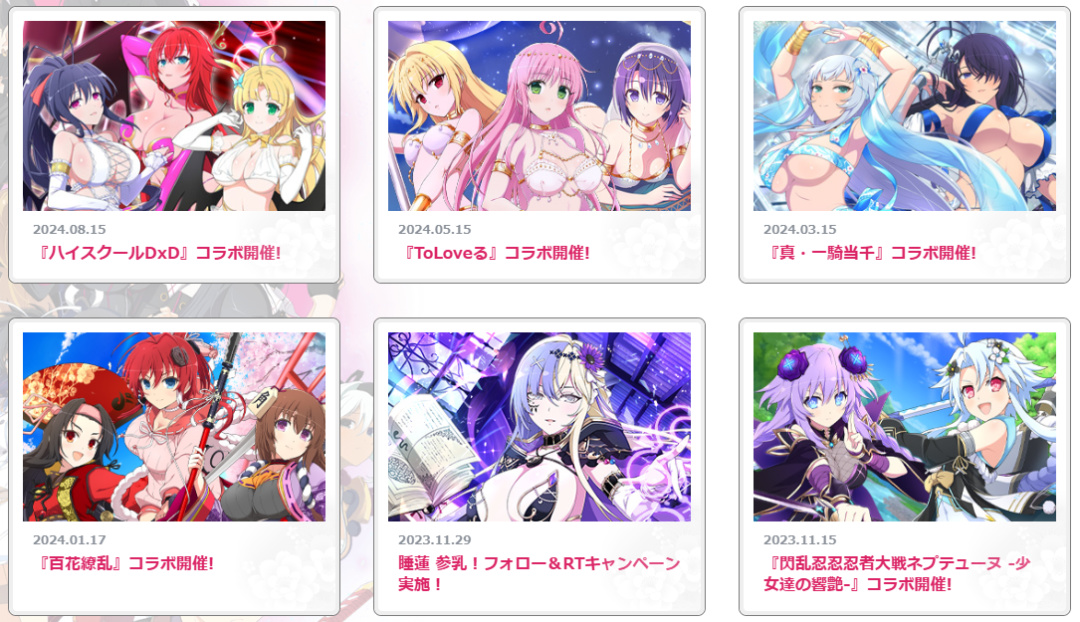 與此同時,這個系列開始深耕二次元紳士作品圈:一方面,《閃亂》手遊經常跟《To love》《惡魔高校》《死或生》《百花繚亂》《一騎當千》等福利IP搞聯動;另一方面,閃亂神樂也被各種二遊拉過去搞聯動,比如《碧藍航線》《崩壞學園2》《海王星》等遊戲都聯動過它。