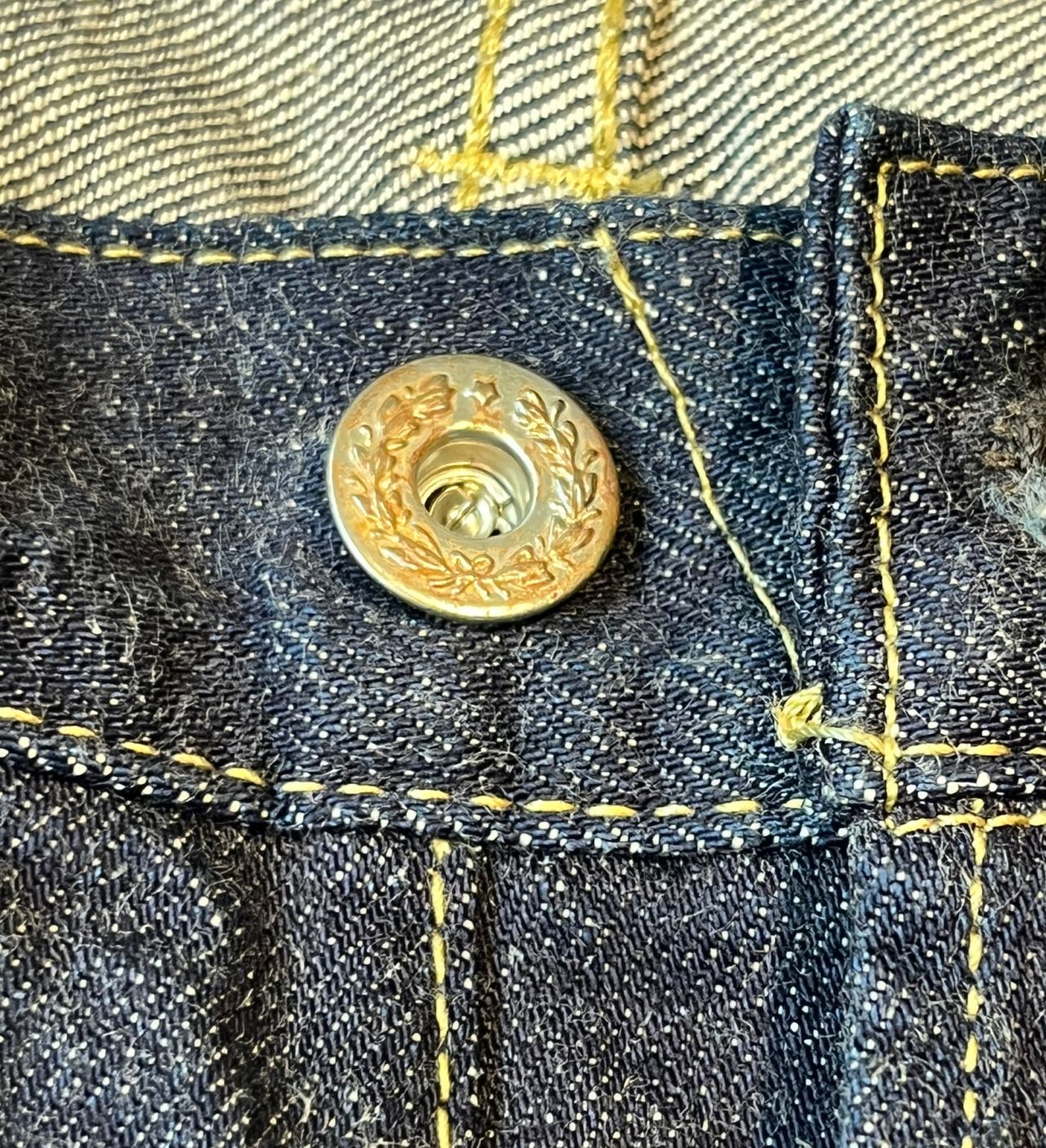 诞生原因是因40年代战时物资紧缺,限制金属使用,取消铜柳钉改为压扣,用更薄的面料,减少一颗纽扣,取消袋盖,简化缝线。使用带有月桂花环的纽扣,寓意和平。