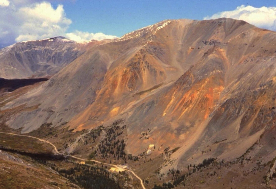 从图中可见在甜屋矿海拔更高的布罗斯(Mt.Bross)山上裸露的黄棕色矿化带,昌西·瓦尔登(Chauncey Walden)摄于1992年