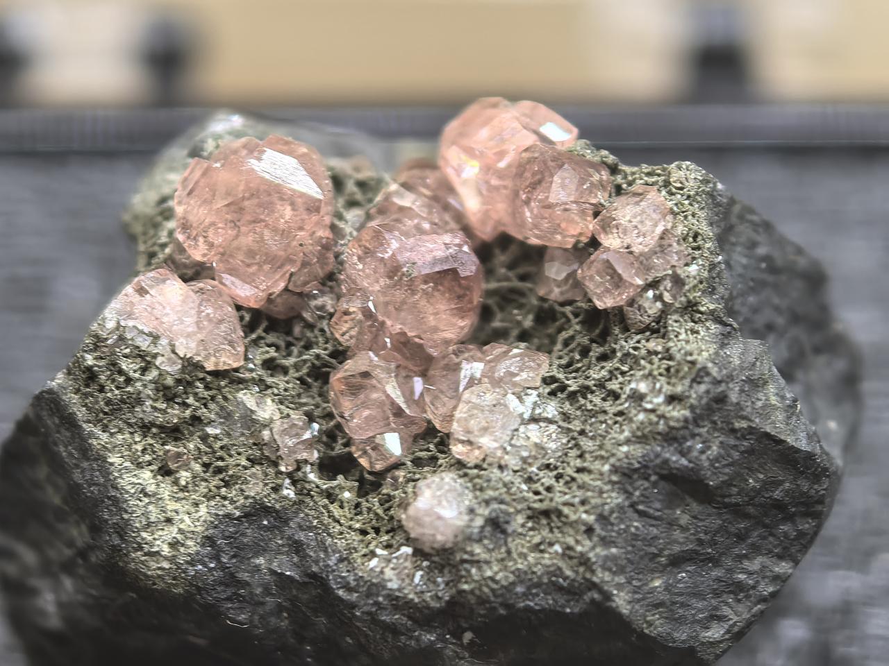 受限于早年挖掘技术。一开始根本做不到把晶体和围岩一起挖出来。菱锰矿的解理性很强。如果受力,晶体很容易产生裂纹,也就卖不出好的价钱了。所以最早只能先给晶洞拍照,把菱锰晶体从水晶丛上摘下来,然后把围岩开采出来,到了工作室,再把菱锰晶体粘回去。就连著名的“阿尔玛王后”也是这样开采出来,之后再修复的。