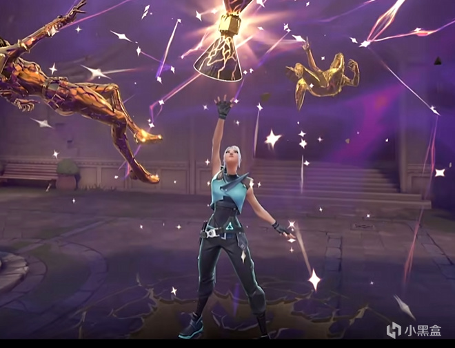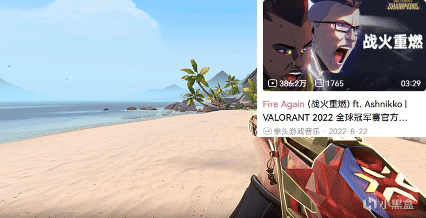 最後就是皮膚的檢視動作和終結特效。檢視放歌,終結領獎,這也算的上冠軍系列皮膚獨一份的專屬公式,在檢視音樂方面,2022年無畏契約冠軍賽的宣傳曲《Fire again/戰火重燃》,比起2021年的《Die for you》和2023年的《Ticking away》,高潮部分稍顯平淡,不夠燃,傳唱度和聽感方面稍顯不足,但也非常帶感。低音爆棚的動次打次,遊戲間偶爾拿出來聽一聽也夠用。