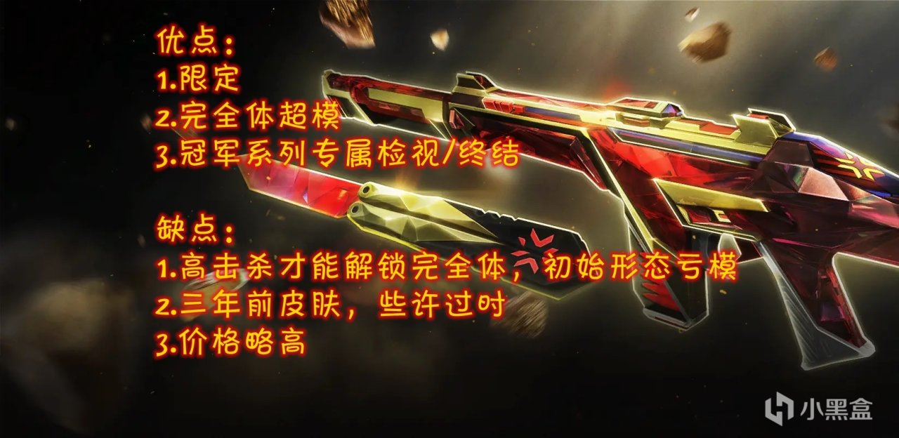 以上,做個總結,優點一是限定皮膚,二是全盛姿態很棒,三是冠軍系列專屬的檢視和終結特效,缺點一是需要玩家自己開啓全盛姿態,才能在遊戲裏解鎖皮膚的完全體,不然大部分時間用的是暗淡無光的省流版,二是作爲三年前的皮膚,部分設計理念過時,三是價格略高。