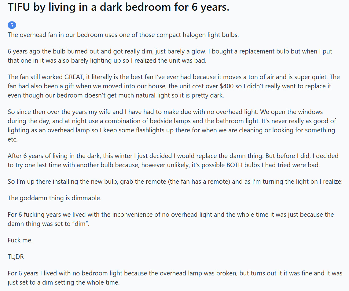 风扇仍然工作得很好,它简直是我用过最好的风扇了,因为它能带动大量的空气,而且超级安静。这个风扇也是我们搬新家时收到的礼物,它的成本超过400美元,所以我真的不想换掉它,尽管我们卧室的自然光线不多,所以很暗。