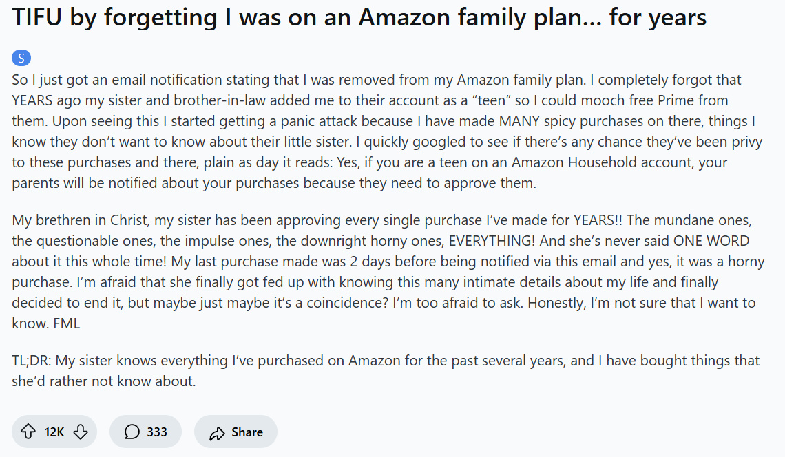 中文省流版:帖主为了蹭姐姐和姐夫的会员,让他们把帖主拉进了亚马逊家庭账户。但帖主不知道的是,作为账号里的青少年,帖主的每一笔消费账户里的父母都会收到通知,因为需要经过他们的批准。而帖主卖了很多私密且少儿不宜的东西,现在帖主感到生无可恋😭。