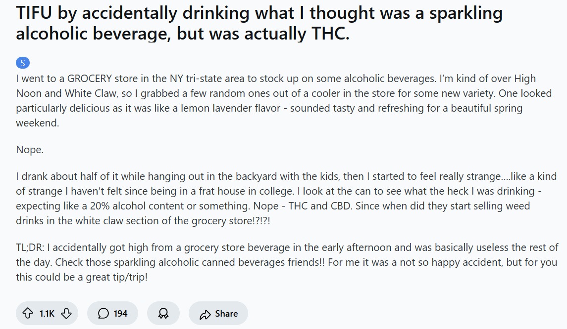 中文省流版:帖主在纽约的杂货店冷藏柜里随手拿了一瓶没喝过的饮料,想尝尝鲜,结果给他喝嗨了。定睛一看居然是大麻饮料🤯,然后那天剩下的时间基本上就废了。