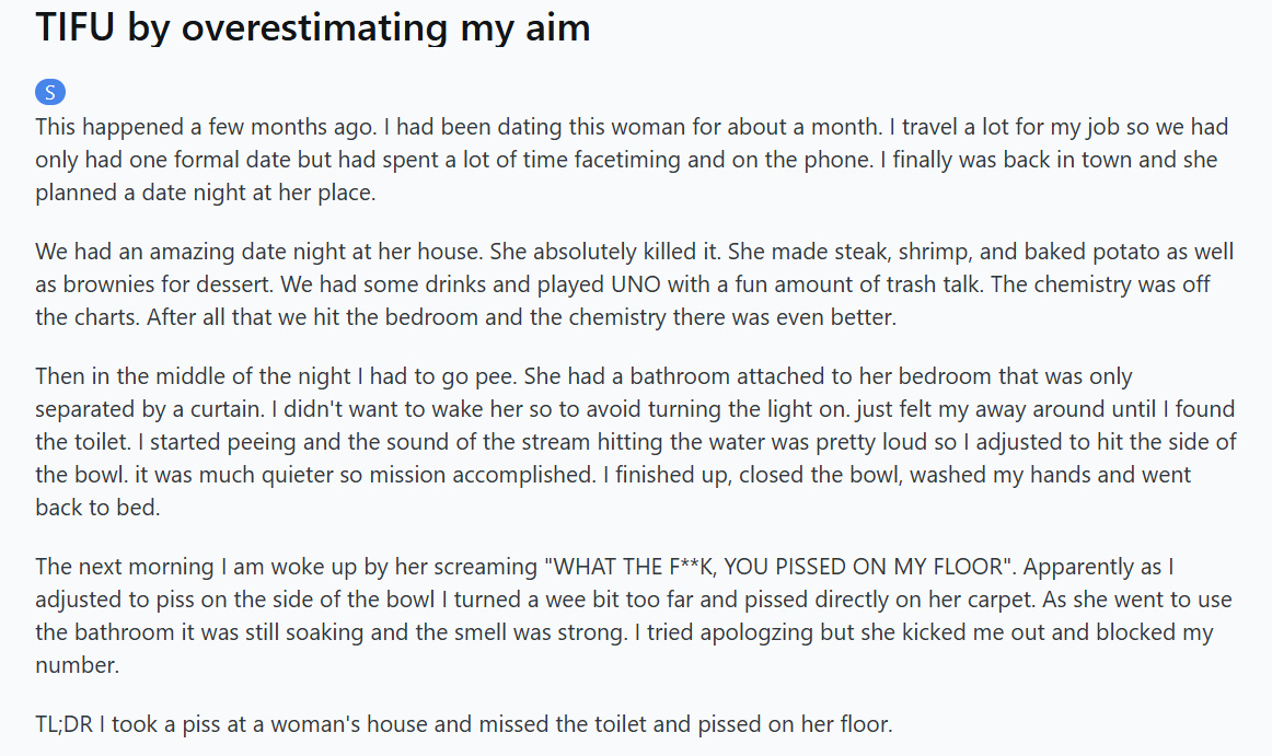 中文省流版:帖主和他的约会对象在她家度过了美好的一晚。当晚帖主起床上厕所,为了不影响对象就没开灯,摸索着找到了马桶,结果最后居然尿到了地毯上(说实话有点抽象😨)。第二天帖主就被她赶了出去。
