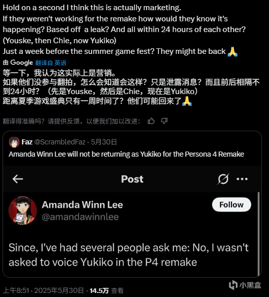 紧接着,千枝的配音艾琳·菲茨杰拉德(Erin Fitzgerald)也表示没收到重制版的邀请。这还没完,雪子的初代配音阿曼达·温·李(Amanda Winn Lee)也加入“队列”,明确回应粉丝:“没被找去配雪子哦!”。