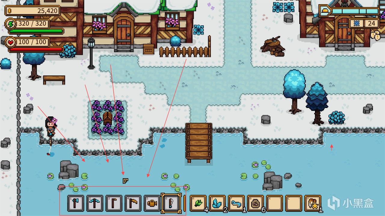 实际上除了这一点,我也特别喜欢另外一个设定,在星露谷物语当中我经常觉得工具栏位容易不在快捷键位,在希望物语当中,制作人将工具额外开出了一个栏位来放置!