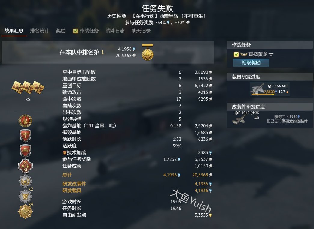 缺点3、不好玩。这架飞机是真的非常无聊,炸战区专用,格斗能力几乎为0,击杀全靠偷!我玩了400多对局,偶尔可以6杀、5杀(见图六)对局失败、研发收益4w1(见图七),大多数情况下1杀、1战区、研发收益8k多一点。技术OK的话打大概300多对局可以开出意大利台风F2000A。400多局可以同时开出台风F2000A + 鹞子AV8B+。开完之后,相信你再也不想拿出这架飞机玩了。而且这个横着飞的火箭放在陆战历史模式里也几乎没有发挥的空间。