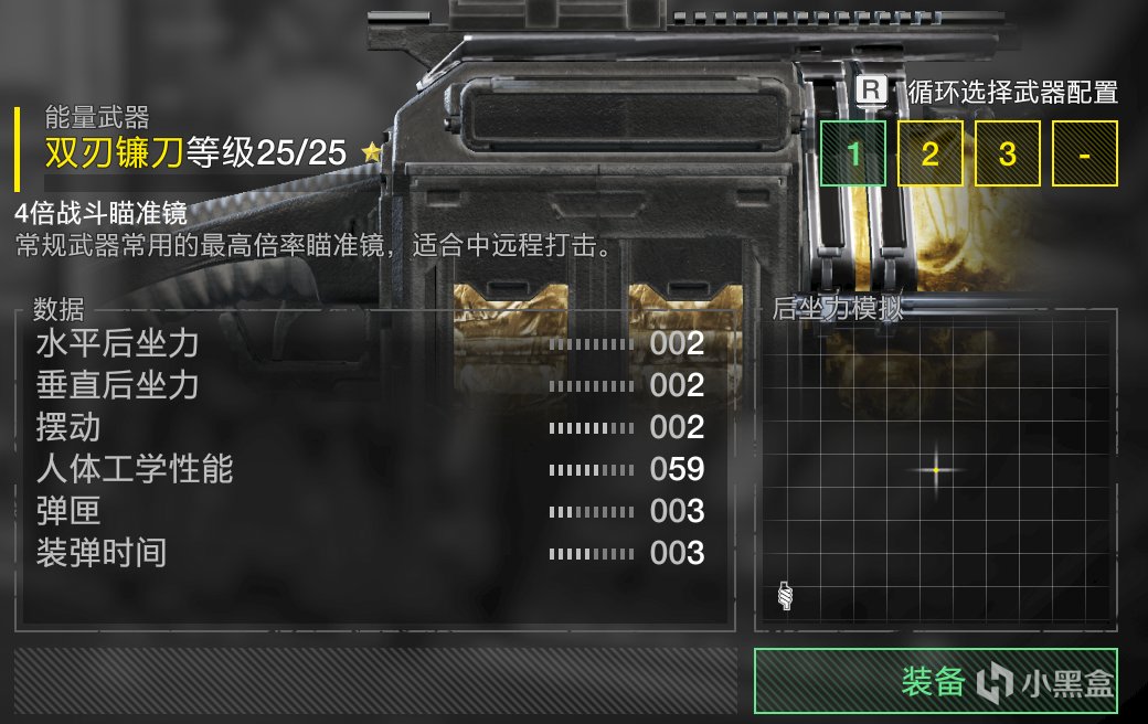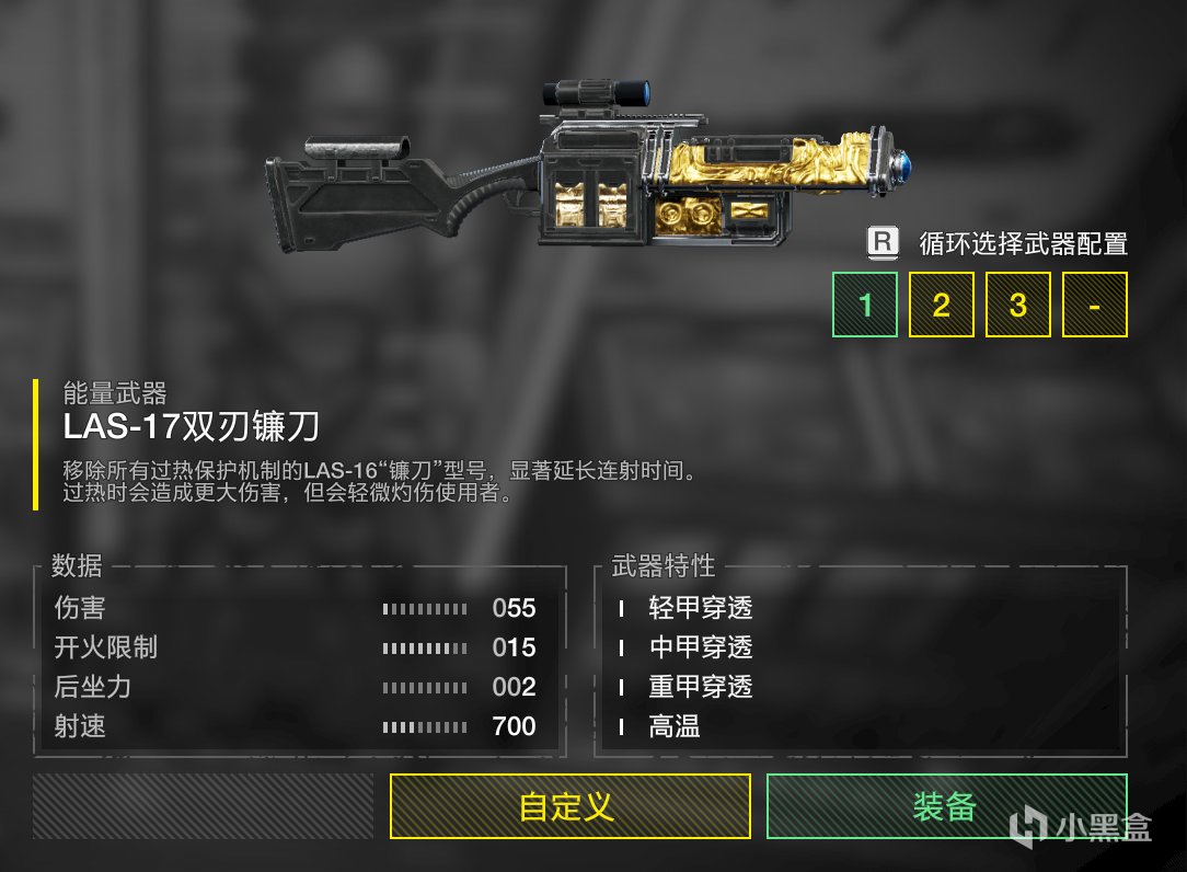 雙刃鐮,十分有特色的一把槍,個人非常喜歡,射得最爽的一集,過熱時會燃燒生命來換取更高的穿甲等級,必須綁定防火中和生命強化使用,不然只能維持在輕穿狀態。進入中穿是如果不穿防火甲會扣除大量生命,進入重穿無論穿沒穿防火甲都會直接點燃。