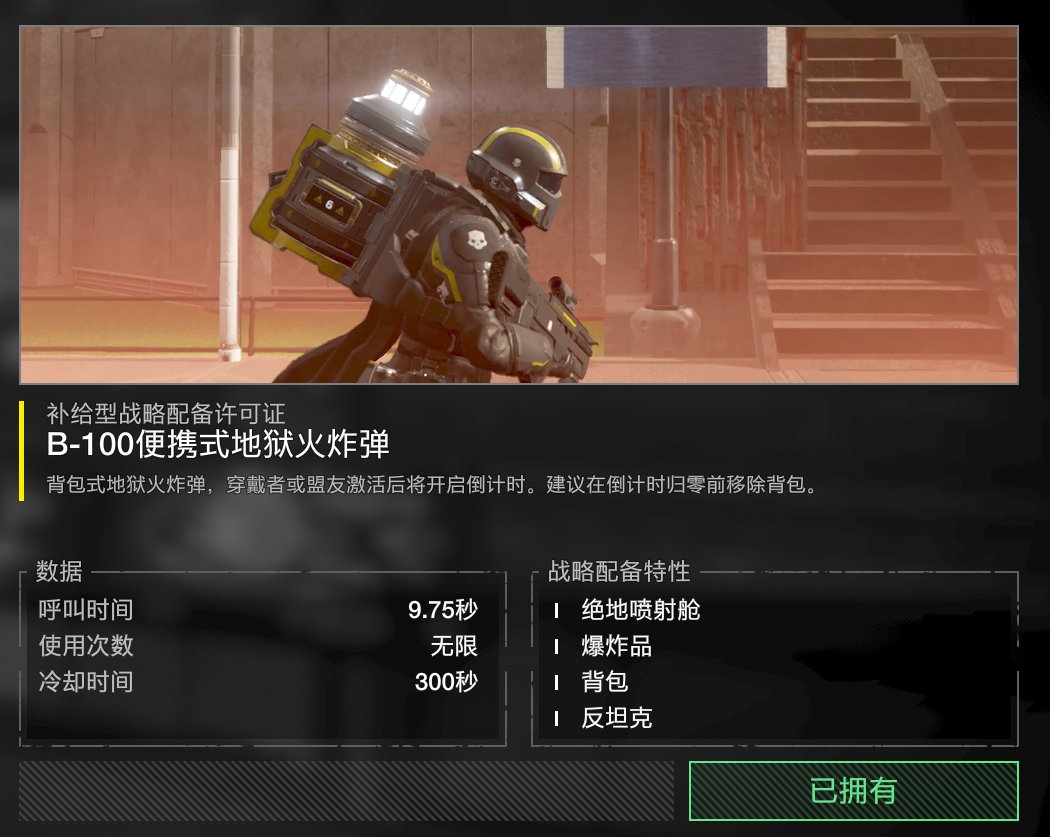 地獄火揹包,地獄火同款的揹包,激活後倒計時12秒後爆炸,建議最晚在激活7秒後脫下,這樣還有一線生機,或者可以穿民主甲鑽進怪堆裏當民主超人,平常打西線建議帶一個,拿來拆炮艇構築者,干擾塔,探測塔。必要時拿去清機器人增援,都很好用的。