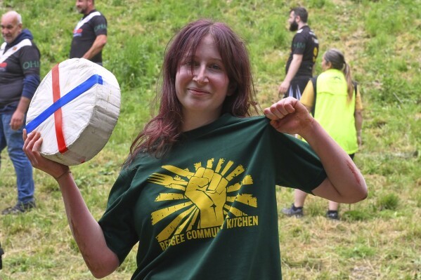 2025 年 5 月 26 日星期一,在英國格洛斯特郡布羅克沃思的庫珀山舉行的傳統年度奶酪滾動比賽女子下坡賽中,艾娃·森德·洛根 (Ava Sender Logan) 贏得女子下坡賽冠軍後展示了奶酪卷。(美聯社照片/安東尼·厄普頓)
