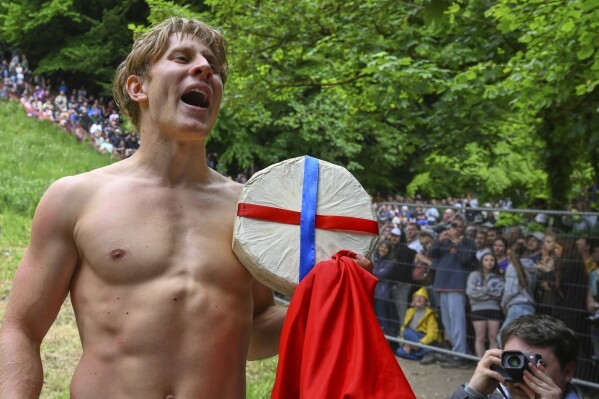 2025年5月26日星期一,在英國格洛斯特郡布羅克沃思庫珀山舉行的傳統年度滾奶酪大賽中,來自德國慕尼黑的選手湯姆·科普克贏得男子速降比賽冠軍後手捧奶酪。(美聯社/安東尼·厄普頓攝)