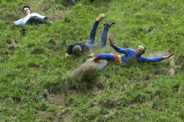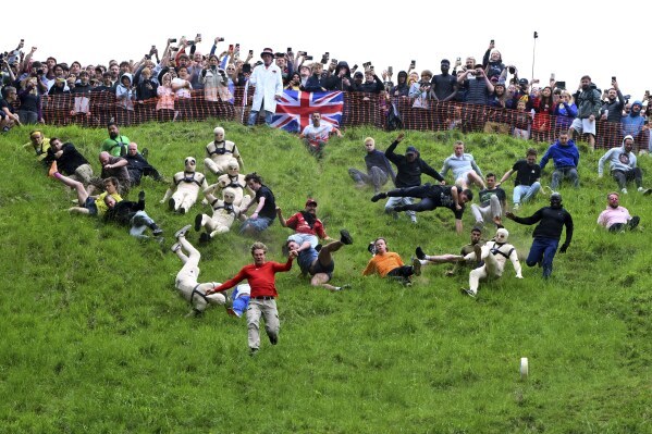 2025年5月26日星期一,在英國格洛斯特郡布羅克沃思的庫珀山舉行的傳統年度奶酪滾動比賽的男子速降比賽中,參賽者中有的身着變形服,扮成“碰撞測試假人”。(美聯社/安東尼·厄普頓攝)