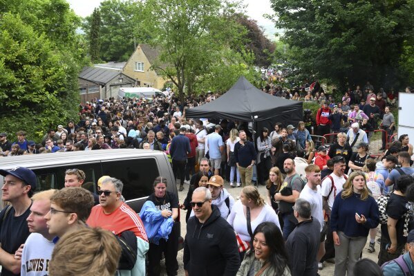 2025年5月26日星期一,人們在英國格洛斯特郡布羅克沃思的庫珀山排隊參加傳統的年度滾奶酪比賽。(美聯社照片/安東尼·厄普頓)