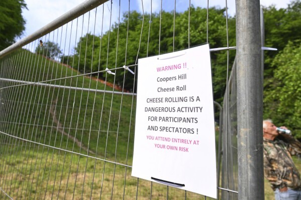 2025年5月26日星期一,在英國格洛斯特郡布羅克沃思的庫珀山舉行的傳統年度滾奶酪比賽中,路標警告參賽者和觀衆注意危險。(美聯社/安東尼·厄普頓攝)