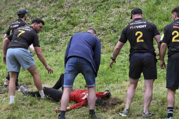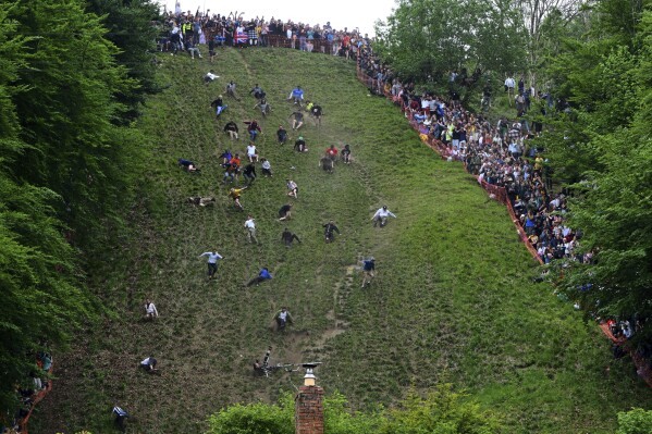 2025年5月26日星期一,參賽者在英國格洛斯特郡布羅克沃思的庫珀山參加傳統年度滾奶酪比賽的男子速降比賽。(美聯社照片/安東尼·厄普頓)