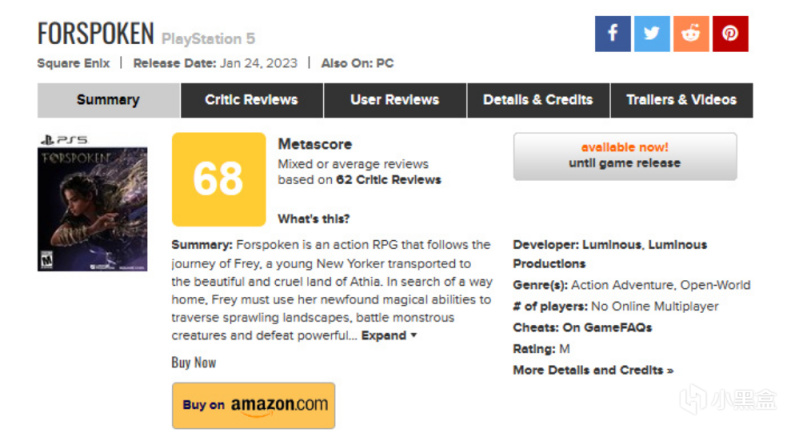 《Forspoken》M站媒體評分解禁:最新的平均分是 68分,是一個及格的分數。根據M站的這份測評公告,有的遊戲媒體認爲該作充滿實驗性,有活力,跑酷很帶感。缺點是戰鬥比較無聊,打擊感欠妥,開放世界也就那樣等。