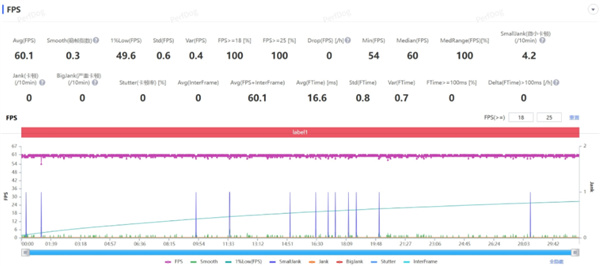 接下来是压力更大的 “ 星铁 ” 星槎海中枢全高画质 30 分钟,平均帧率仍然是 59.5 帧一条直线,表现相当好。