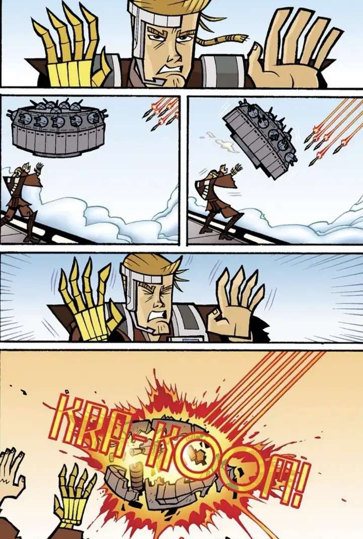 一躍而起到半空中,用原力拆金屬建築,然後讓其零件像子彈一樣穿透賞金獵人們;