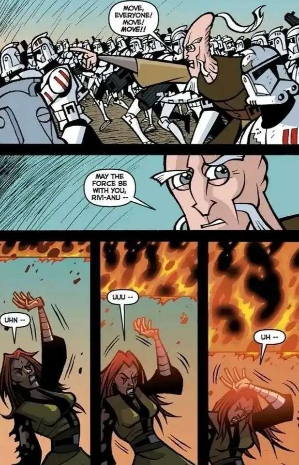 在傳說宇宙克隆戰爭動畫(CW)中將敵人連同裝甲部隊直接用原力送回原處;