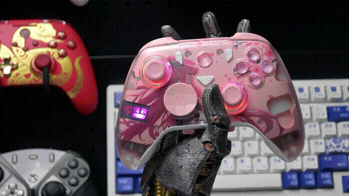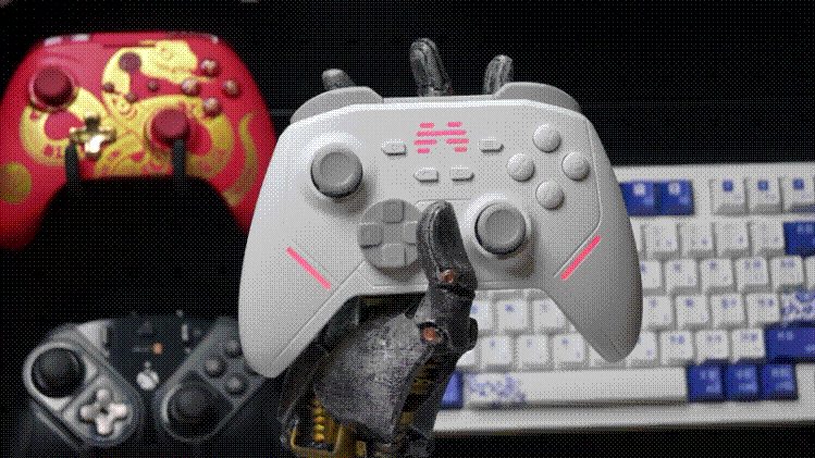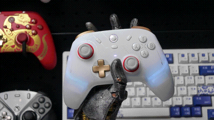 高颜值与高性能的代表,配置非常顶,支持三模连接方式,双霍尔,摇杆带pom环及金刚圈。带握把震动,三段式扳机锁、摇杆、十字键盘面可替换,磁吸面壳,机械微动动作键、四个拓展按键。支持体感,带智能底座,支持智能启停。