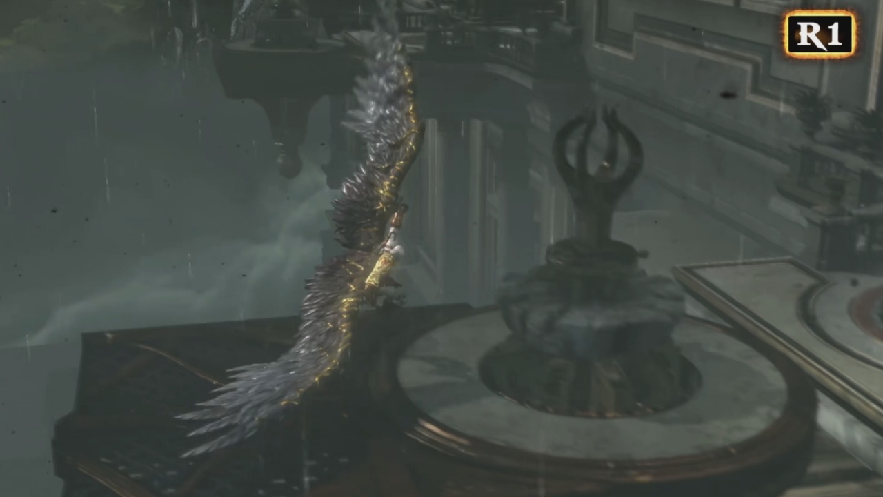 好在奎托斯滑行途中找到了一处借力点,一跃而起、随后又重重踩下,将被掀起来的地面又压了回去。