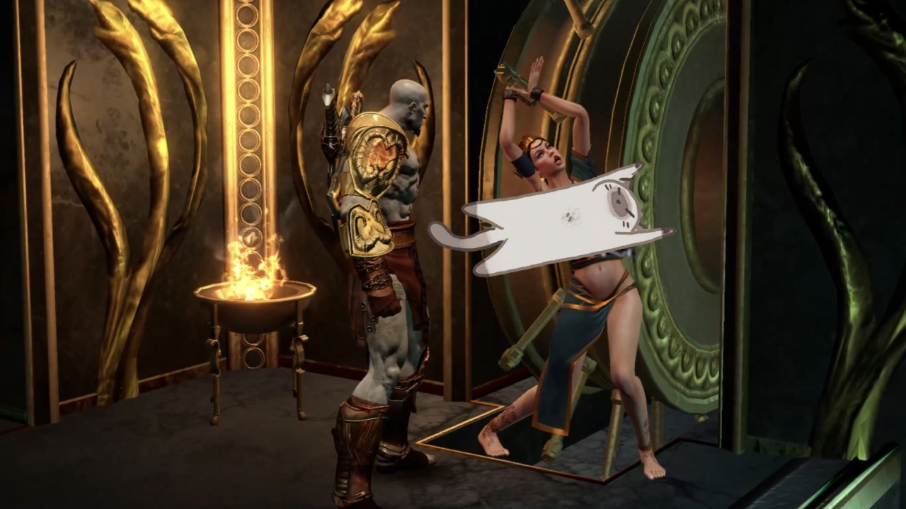 奎托斯想查看潘多拉的情况,却发现她早已不在原地———她已经跑到了圣火前!
