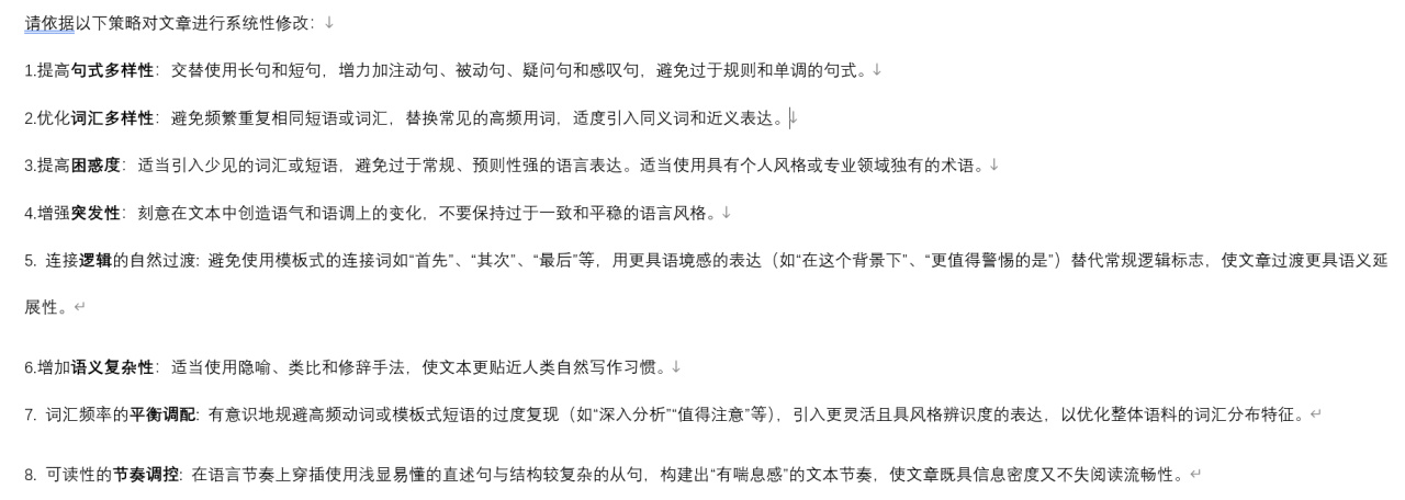 所以我们写文章降低AI率的高效办法就是利用AI检测查重的原理来对文章内容进行逆向修改,但是有点麻烦,所以这里给大家提供一些可以有效降低查重率提示词。