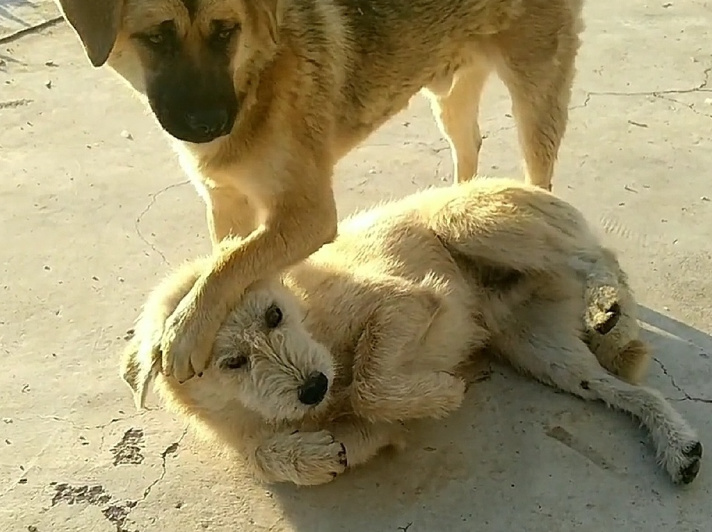 據說長毛小時候也是被名叫大頭的黑鼻大黃狗壓着打的。