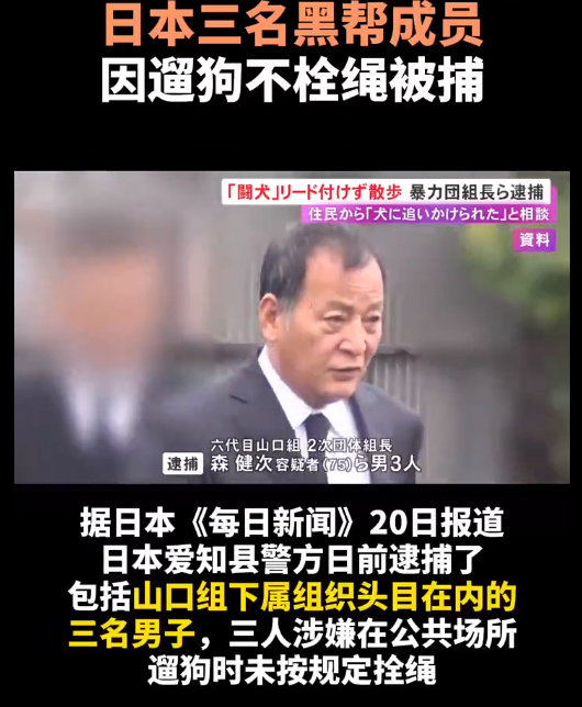 近日,日本六代目山口組二級組織的75歲頭目,與隨行的幹部和組員因在公園遛狗不栓繩被捕。