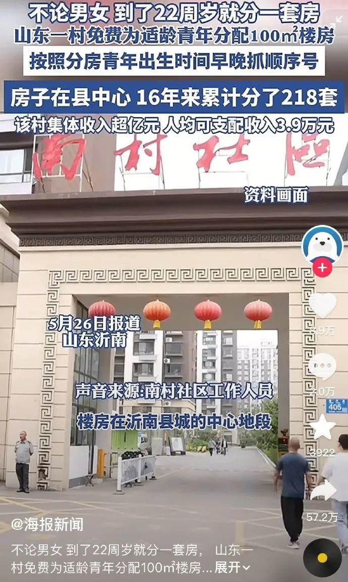 山東省沂南縣某村社區從2009年就開始免費爲適齡青年分配樓房,今年分配的是第11批,共有6名適齡青年每人分到了一套100平方米的樓房。
