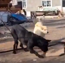 視頻中,兩隻狗正打得難分難捨,老大突然出現後,在場的所有狗都俯首稱臣了。