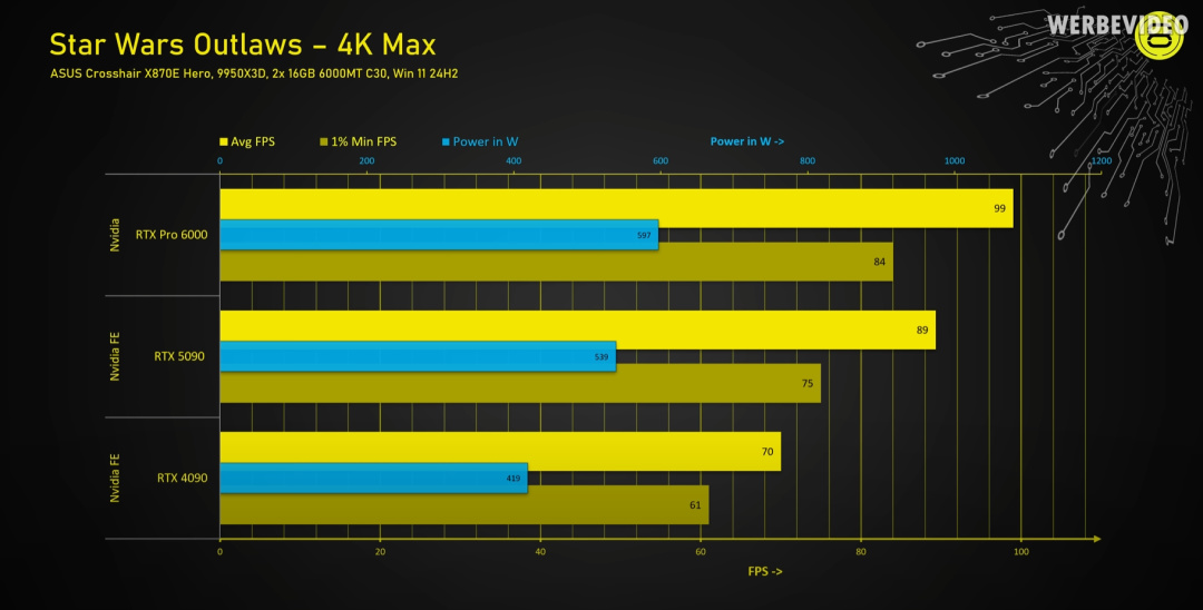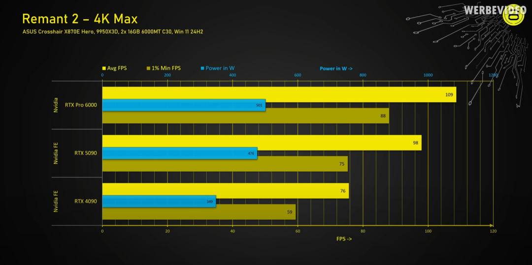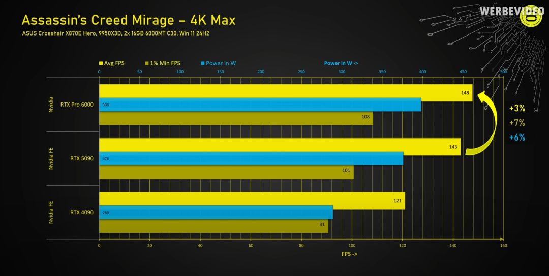 如图可见,RTX Pro 6000平均比RTX 5090快了14%,并且其1%Low FPS指标也比RTX 5090快13%。不过它的功耗水平也提升了15%。但是如果你是能够花费10000美元购买这种级别显卡的用户,我觉得你应该也不太会在意功耗差异。