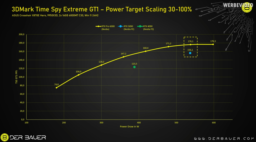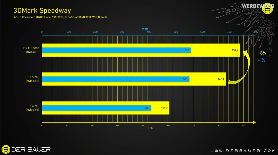 先来看理论测试,der8auer运行了Time Spy Extreme GT1和Speed Way测试,在TSE中,虽然性能相较RTX 5090增加了13%,但是其功耗也增加了11%: