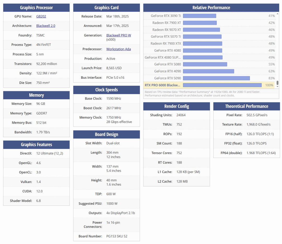 它基于GB202芯片,启用了全系列最多的24064个CUDA核心,但依然不是GB202 GPU的完整规格。它拥有752 个纹理映射单元和 192 个光栅单元 (ROP)。此外,它还拥有 752 个第五代张量核心和188个第四代光线追踪加速核心。