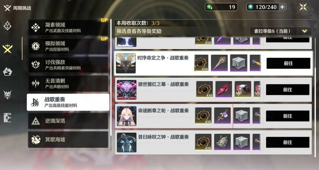 但实际上,角色技能并不需要全部升至 10 级,三个主要技能升满以及固有和分支强化技能达到相应要求,只需 18 个周本材料,即 2 周即可收集完成。同理,其他新角色如露帕的材料收集也可参照此方法。