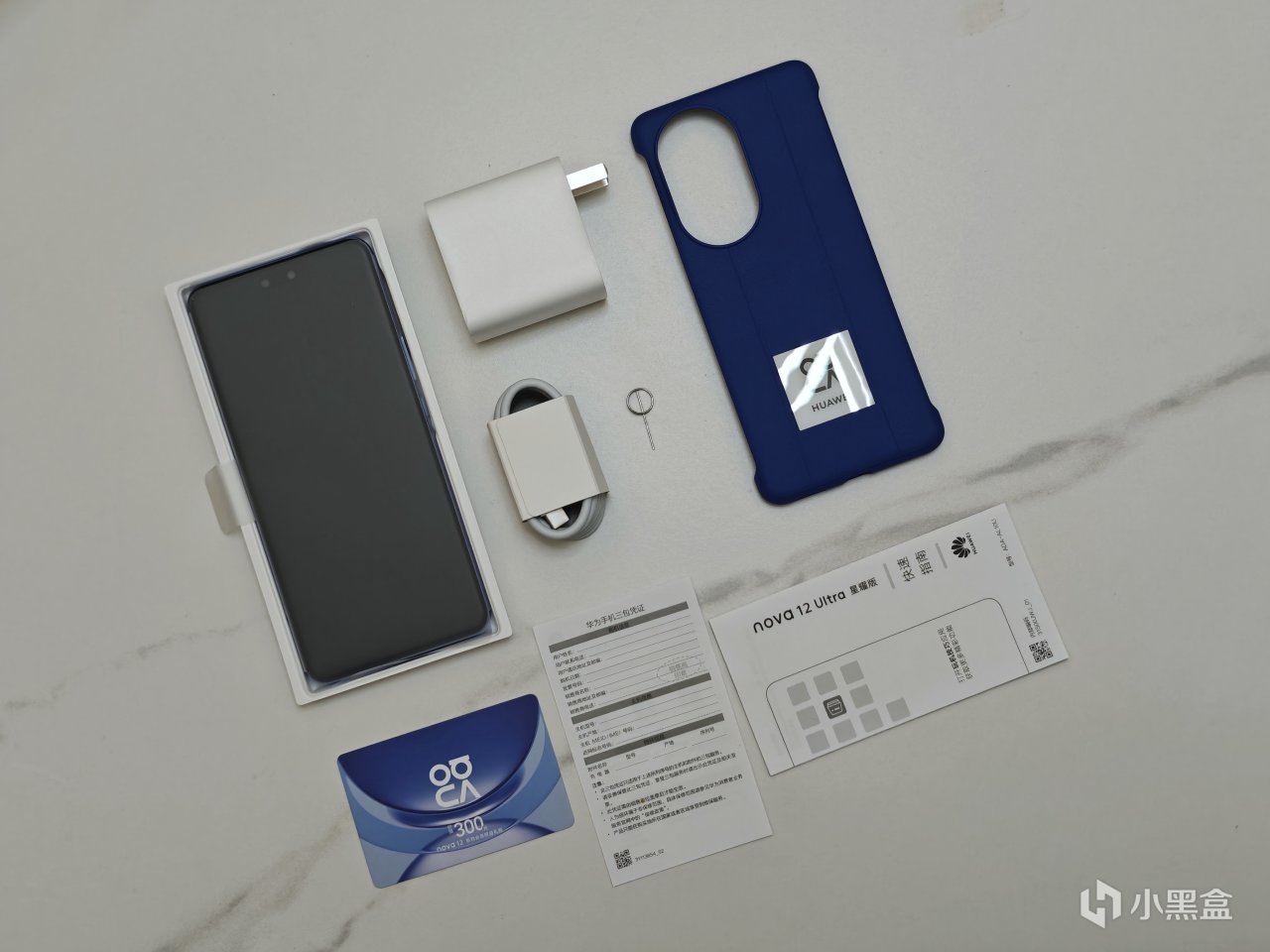 华为 nova 12 Ultra 星耀版包装清单包含:华为全能充电器(Max 100W)、USB Type-C 数据线、超薄PU保护壳、取卡针、TP保护膜、三包凭证、快速指南以及会员权益礼包。手机出厂时已贴有保护膜,可有效保护屏幕免受刮擦。