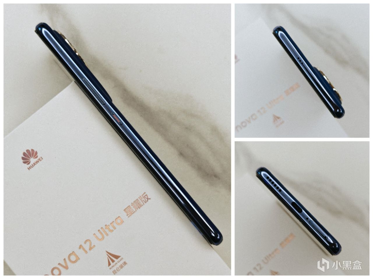 华为nova 12 Ultra星耀版秉承简约美学与人体工学理念,在侧面轮廓上精雕细琢,实现了功能布局的实用性与视觉美感的和谐统一。右侧设有简洁的音量键(包含音量加减)和电源键,按键与机身配色融为一体,操作手感舒适;左侧则采用无按键设计,保持整体对称美感的同时提升握持舒适度。底部区域依次布局了扬声器开孔、Type-C充电接口、麦克风开孔以及SIM卡槽,便于用户插入或取出SIM卡。细节设计精致实用,兼顾出色的音频输出与高效快充体验。整机采用圆润的一体化设计,边角过渡自然流畅,厚度控制得当,不仅显著提升了握持舒适度,更展现出时尚精致且富有科技感的外观风格。