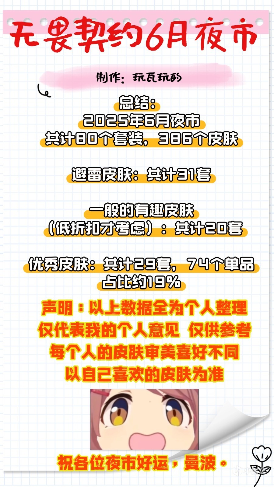 本次夜市共計有80個套裝,386個皮膚進入夜市隨機池,從幾百個皮膚中抽到幾個心儀皮膚的概率確實不容樂觀。下面對本次夜市的所有皮膚進行簡單的盤點,分爲避雷皮膚,一般皮膚和優秀皮膚,以下全部爲個人主觀意見,僅供參考。