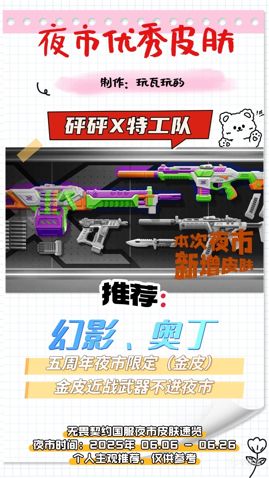砰砰X特工隊套裝推薦幻影和奧丁,最推薦幻影。這套皮膚是塑料玩具風格,開火音效和擊殺反饋非常爽,價值體現在聲音上。