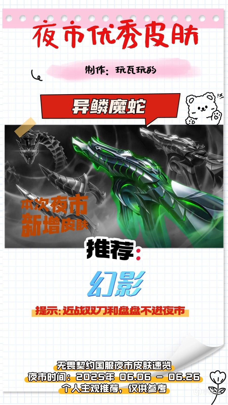 新加入的異鱗魔蛇套裝,幻影可入,套裝裏近戰武器雙生獠牙價格原因不進夜市,盤盤不算皮膚也不進。