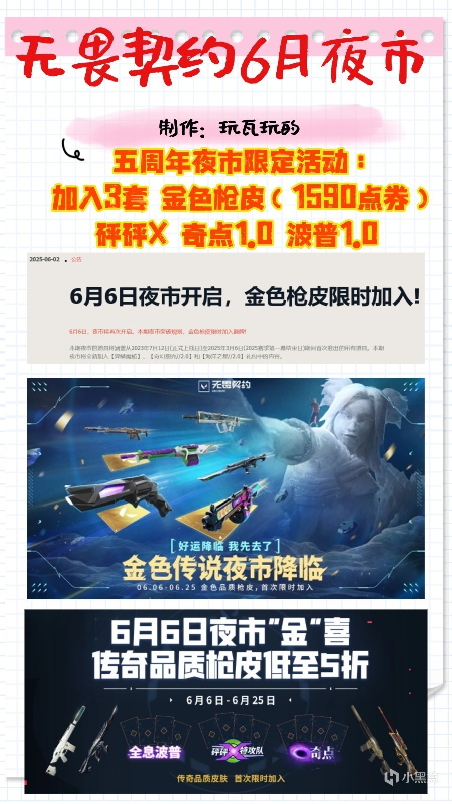 第二個是新增了三套1590價位的金色皮膚,按以往規則,1590點券的金色槍皮不會進入夜市,官網看到,爲了慶祝無畏契約五週年,所以加入了砰砰X特工隊,奇點1.0和全息波普1.0三套金色老古董槍皮進入夜市。