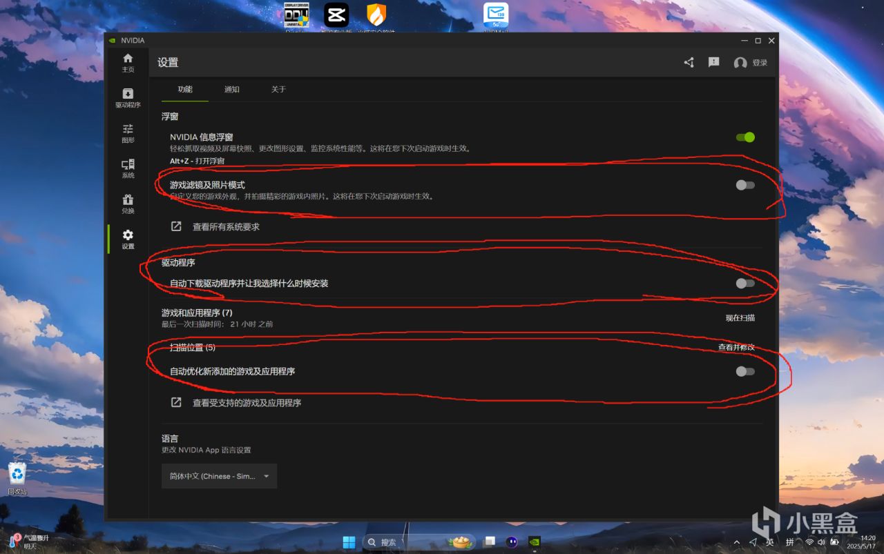 注:顯卡驅動回退成功後3D設置需要重新配置,如關閉三重緩衝,關閉垂直同步,選擇獨顯等,如果有英偉達app,建議把圈出來的三個開關關閉
