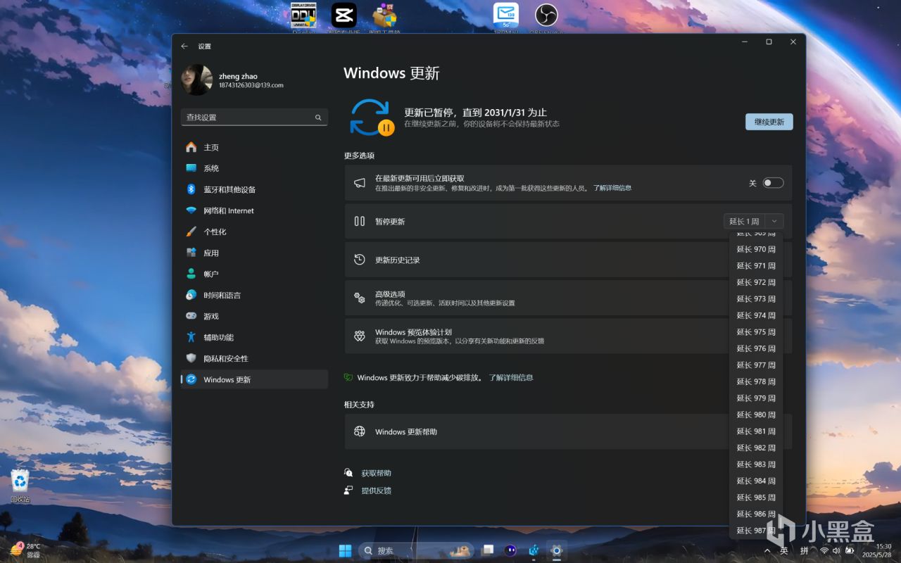 點擊暫停更新,想停止更新幾周都可以,我隨便選了一下,更新已經暫停到2031年了,如果有需要,可以隨時點擊繼續更新,