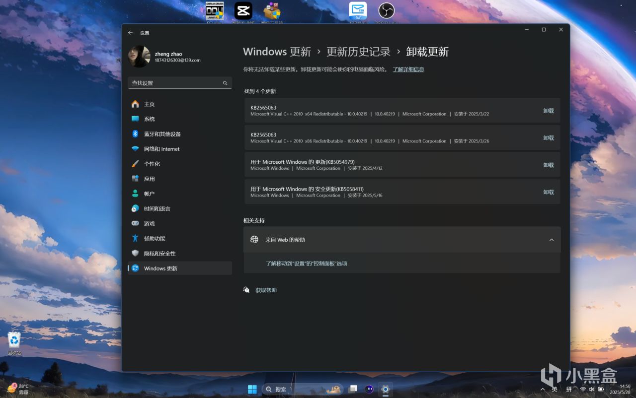 首先快捷鍵Win+i打開設置,下滑到Windows 更新、點擊更新歷史記錄,找到相關設置“卸載更新”並點擊,